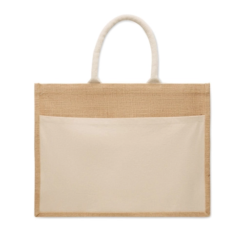 Shopping bag made of laminated jute and 280 gr/m² cotton canvas with cord handles. Includes large open front pocket.