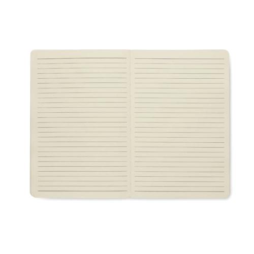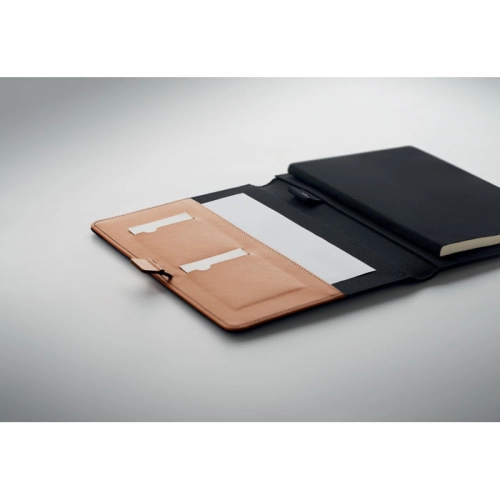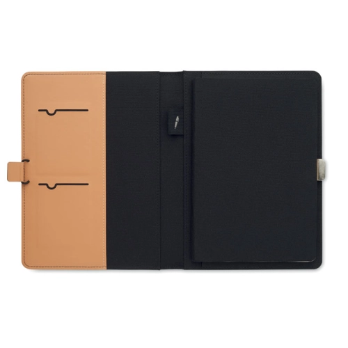 A5 portfolio in RPET with faux leather details. Replaceable A5 notebook with hard cork cover. Case bound. 128 recycled paper lined pages (64 sheets). Pen holder. 2 cardholders and one big compartment. Elastic closure strap with metal detail. FSC®-certified | FSC MIX, P8.6, FSC-C213206