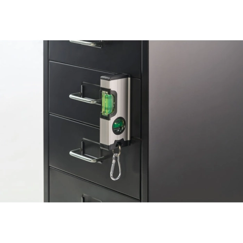 Mini magnetic double spirit level in aluminium case with carabiner. The carabiner is not for climbing (non-professional use).