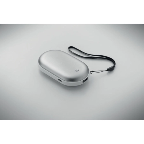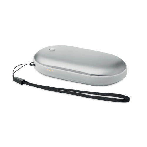 Aluminium electric hand warmer with 3 heat levels (45°C, 50°C, 55°C) and built-in 5000mAh power bank. Dual-sided heating, Type-C input/output, USB-A and DC5V/2A output and charging cable included.
