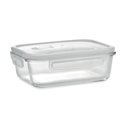 High borosilicate glass lunch box with air tight locking lid in PP. Suitable for microwave. Capacity 900 ml.
